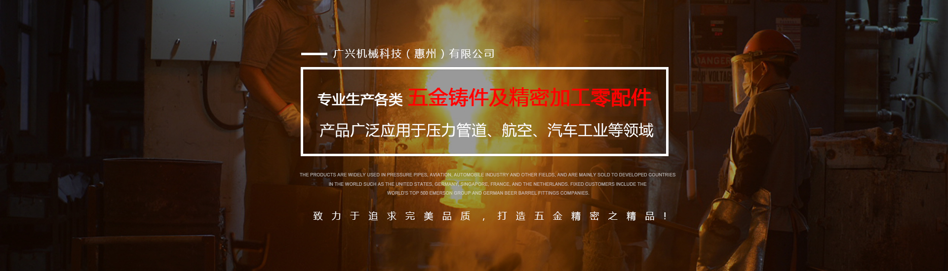 公司專業(yè)生產(chǎn)各類五金鑄件及精密加工零配件,可熔煉材質為全系列不銹鋼及碳鋼,主要生產(chǎn)材質有304、316、316L、17-4、430、409等,年生產(chǎn)各種不銹鋼鑄件1000余噸。產(chǎn)品廣泛應用于壓力管道、航空、汽車工業(yè)等領域,主要銷往美國、德國、新加坡、法國、荷蘭等世界發(fā)達國家,固定客戶有世界500強艾默生集團及德國啤酒桶配件公司。